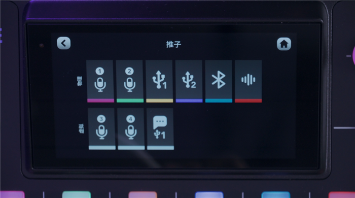 最后我们来讲一下设置与交互界面,上方的 5.5 寸触摸屏显示了很多信息。你可以创建一个用户,选择头像,后面是日期时间、存储卡信息、以及音箱音量,总输出电平指示,设置按钮。下方是每一路通道,竖线左侧是实体推子,竖线右侧是虚拟的通道。点击虚拟通道可以进行音量方面的调节,点击进虚拟通道下方的名字就进入到这个通道的设置。右侧是智能打击垫,点击即可随意修改任何一个智能打击垫里的声音,或者创建一个你想要的智能打击垫的设置。