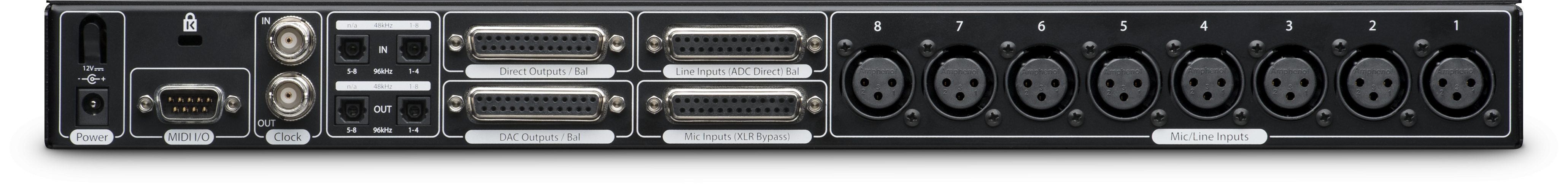 Flexible rear-panel I/O makes it easy to incorporate the DigiMax DP88 into any studio environment. Access the preamps using XLR or DB25 connections. Eight direct, analog-to-digital, line-level inputs are available on DB25 and can be accessed per channel with a front-panel button, allowing you to keep all of your gear connected at the same time. Eight balanced DAC outputs are provided via DB25 so you can expand your interface’s outputs for monitor mixes or speaker switching. You also get eight balanced direct outputs on DB25 and eight channels of ADAT/dual SMUX optical I/O up to 96 kHz.