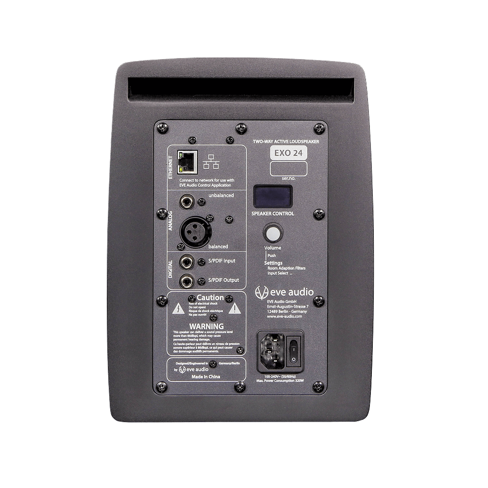所有关键系统参数均清晰显示在屏幕上,旋钮则可精确调节输出音量、空间适应滤波器和输入源选择等核心设置。EXO 24 支持便捷的软件控制、精准校准以及面向未来的固件更新,用户可直接在音箱上实时调整,无需中断创作流程。